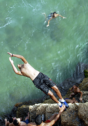 7月28日,在以色列北部海濱城鎮(zhèn)阿克,一名男孩從海邊古城墻上縱身躍入大海。近一周來,以色列全境持續(xù)干旱高溫天氣,最高平均溫度達(dá)到35攝氏度以上,局部超過40攝氏度。到海邊游泳度假成了以色列人最主要的休閑活動。