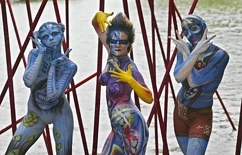 7月29日,三名模特參加在德國西部英格爾海姆舉行的德國人體彩繪藝術(shù)節(jié)。今年藝術(shù)節(jié)的主題是“異域之美”與“未來”。