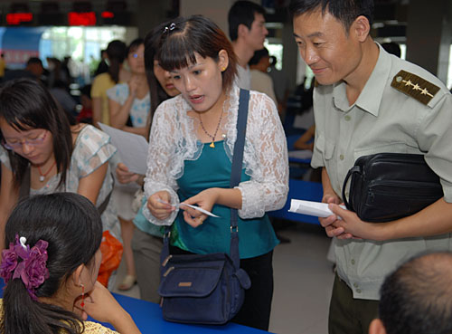 7月31日,一名軍嫂在了解聘用信息。當(dāng)日,山東濰坊市勞動就業(yè)部門舉辦“2007年濰坊市隨軍家屬就業(yè)雙選會”,72家用人單位提供管理、財會、商業(yè)服務(wù)等2000多個就業(yè)崗位。同時,該市還開辦了隨軍家屬免費(fèi)技能培訓(xùn)班,136名來自駐濰坊部隊(duì)的隨軍家屬參加了培訓(xùn)。