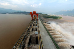 洪水通過三峽大壩下泄。