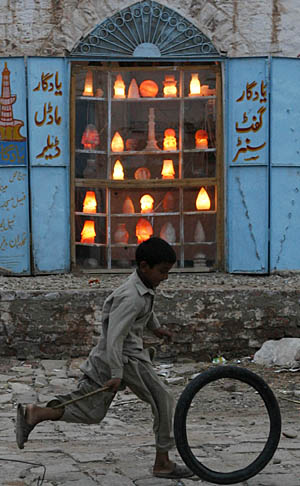 4日,一名男孩在巴基斯坦凱沃拉的一個鹽礦石工藝品櫥窗前玩耍。巴基斯坦的凱沃拉以其石鹽礦聞名,許多當?shù)厝艘灾谱鼷}礦石工藝品為生,一名工人每天的報酬平均為250盧比(約合5美元)。