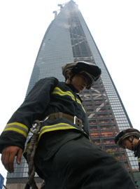8月14日,消防員在發(fā)生火災(zāi)的上海環(huán)球金融中心工地滅火搶險(xiǎn)。 當(dāng)日下午16時(shí)30分左右,位于上海浦東的環(huán)球金融中心在建大廈失火。上海市公安、消防部門(mén)趕赴現(xiàn)場(chǎng)撲救。到17時(shí)45分左右,火勢(shì)被消防部門(mén)撲滅。這起事故中沒(méi)有人員傷亡,具體事故原因還在進(jìn)一步調(diào)查中。