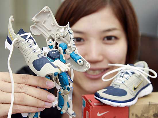 在日本首都東京,一名婦女在展示日本一家玩具廠生產(chǎn)的變形玩具。這個玩具的外觀為一只13.5厘米長的耐克運動鞋模型(右),拆開后就可以形成一個類似變形金剛的機器人(左)。