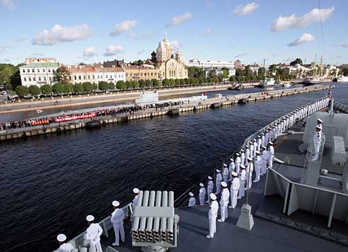 27日,中國海軍艦艇編隊抵達俄羅斯圣彼得堡市。由“廣州”號導彈驅(qū)逐艦和“微山湖”號綜合補給艦組成的出訪歐洲4國艦艇編隊,經(jīng)過34天、1萬多海里的連續(xù)航行,27日抵達俄羅斯圣彼得堡,開始進行為期4天的友好訪問,并參加在這里舉辦的“中國年”活動。