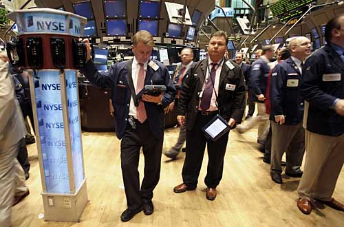 28日,交易員在美國(guó)紐約證券交易所工作。受一系列利空消息影響,紐約股市當(dāng)日全面下挫,其中道瓊斯指數(shù)重挫280.28點(diǎn)。