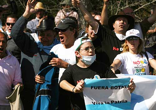2日,在烏拉圭河?xùn)|岸的烏邊境城市弗賴本托斯市,阿根廷民眾抗議烏拉圭在該地區(qū)興建造紙廠。烏拉圭政府于2005年批準(zhǔn)一家芬蘭公司在與阿根廷交界的弗賴本托斯興建一座造紙廠。阿政府認(rèn)為,造紙廠勢必會對阿邊境地區(qū)的生態(tài)環(huán)境、居民生活和旅游業(yè)構(gòu)成威脅,并要求烏方停止建廠。雖然烏拉圭和阿根廷兩國政府代表團就此問題進行過技術(shù)性會談,但沒有取得實質(zhì)性進展。