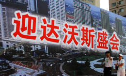 9月4日,兩名大連市民從街頭宣傳牌前走過。世界經(jīng)濟(jì)論壇首屆新領(lǐng)軍者年會將于9月6日在大連開幕。目前,大連街頭“達(dá)沃斯”氣氛漸濃,大連市民將以巨大的熱情迎接來自國內(nèi)外的嘉賓。