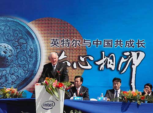 9月8日,美國英特爾公司大連芯片廠奠基典禮在大連經(jīng)濟(jì)技術(shù)開發(fā)區(qū)舉行。根據(jù)中美雙方簽訂的合作協(xié)議,美國英特爾公司大連芯片廠首期投入25億美元,項(xiàng)目建設(shè)期為5年。正在大連參加夏季達(dá)沃斯年會(huì)的美國英特爾公司董事會(huì)主席克瑞格·貝瑞特、大連市市長夏德仁出席奠基典禮出席奠基典禮。這是美國英特爾公司董事會(huì)主席克瑞格·貝瑞特在典禮上致辭。