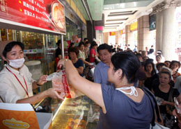 9月25日,在上海南京東路步行街上,市民排著長隊購買鮮肉月餅。當日是中秋佳節(jié),傳統(tǒng)的鮮肉月餅以獨特口味受到上海市民的歡迎。