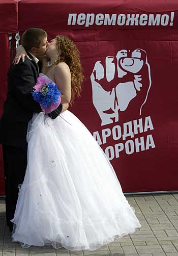 25日,在烏克蘭的頓涅茨克,一對(duì)新婚夫婦在一個(gè)政黨為競(jìng)選宣傳搭起的帳篷前相擁而吻。烏克蘭將于9月30日舉行議會(huì)選舉。