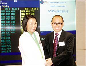 “上市以后,有人擔(dān)心我的頭發(fā)會因為責(zé)任的增大而越來越少!”SOHO中國董事長潘石屹昨日在上市儀式上詼諧地說。不過,他和夫人張欣的財富卻因上市而越來越多了。以昨日(8日)SOHO中國收市價9.55港元計算,兩人所持股份的市值達(dá)317.45億港元,由此躋身中國富豪榜前列。 作為今年在港上市的明星地產(chǎn)股,SOHO中國此次集資128.6億港元,與今年上半年締造了內(nèi)地新首富的碧桂園旗鼓相當(dāng)。SOHO中國昨日開盤報10.1港元,較招股價8.3港元漲21.69%,午后雖隨大市走低有所回落,但仍收報9.55港元,較招股價高出15.06%。該公司目前總股本為50億股(不包括超額配售權(quán)行使所發(fā)股份),以昨日收盤價9.55港元計算,公司總市值為477.5億港元。