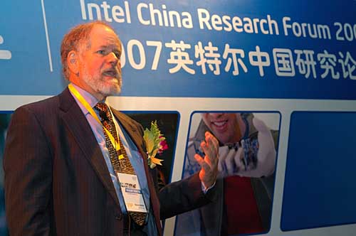 10月10日,“2007英特爾中國(guó)研究論壇”在北京舉行,論壇展示了來(lái)自英特爾中國(guó)研發(fā)機(jī)構(gòu)的40多項(xiàng)最前沿的科研成果。 本屆論壇以“源動(dòng)創(chuàng)新,恒致千里”為主題,旨在與業(yè)界各方深入探討企業(yè)研發(fā)機(jī)制、可持續(xù)性創(chuàng)新發(fā)展等全球關(guān)注話題,并共同分享創(chuàng)新方法、成功經(jīng)驗(yàn)以及最新研究成果,感受由科技創(chuàng)新帶來(lái)的激情體驗(yàn)和強(qiáng)勁動(dòng)力。會(huì)上,英特爾還展出了來(lái)自英特爾中國(guó)研究中心及英特爾亞太研發(fā)中心(APRC)的最新研究成果共40余項(xiàng)。 圖為英特爾公司企業(yè)技術(shù)事業(yè)部資深院士兼通信技術(shù)實(shí)驗(yàn)室總監(jiān)康凱文博士在論壇做主題為《建造英特爾創(chuàng)新發(fā)動(dòng)引擎》的演講。 | |