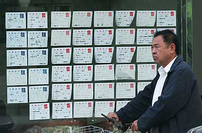 10月23日,一位行人從上海一家房產(chǎn)中介的二手房信息欄旁走過。當(dāng)日,上海信義房產(chǎn)、美聯(lián)物業(yè)、中原地產(chǎn)、漢宇地產(chǎn)四家房產(chǎn)中介咨詢公司的統(tǒng)計數(shù)據(jù)顯示,10月中上旬,上海二手房市場成交量較上月同期下跌15%至20%。