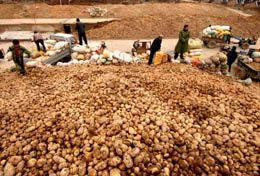 金秋十月,青海省互助土族自治縣近30萬(wàn)畝馬鈴薯喜獲豐收。青海省互助土族自治縣生產(chǎn)的馬鈴薯具有優(yōu)質(zhì)豐產(chǎn)、退化慢等優(yōu)良特點(diǎn),產(chǎn)品在國(guó)內(nèi)市場(chǎng)十分暢銷。這是青海省互助土族自治縣農(nóng)民在搬運(yùn)即將外銷的馬鈴薯。