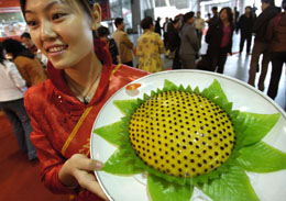 11月1日,一家參展企業(yè)的工作人員向參觀者介紹糧食制品“葵花餅”。 當(dāng)日,第七屆中國(guó)糧油精品展示交易會(huì)在南京國(guó)際展覽中心開(kāi)幕,來(lái)自全國(guó)17個(gè)省、市、自治區(qū)的參展團(tuán)、中外500多家參展企業(yè)展示放心糧油產(chǎn)品、糧油深加工產(chǎn)品以及糧油加工、運(yùn)輸、倉(cāng)儲(chǔ)機(jī)械設(shè)備和相關(guān)技術(shù)。 |