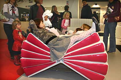 4日,小朋友們在意大利羅馬新國際展覽中心舉辦的家具展上體驗(yàn)新式沙發(fā)。為期9天的羅馬國際家具展當(dāng)天在羅馬新國際展覽中心閉幕。節(jié)省空間、新穎別致和極具人性化的設(shè)計(jì)風(fēng)格是本屆展會的突出特點(diǎn)。