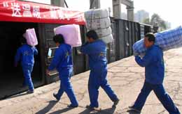 11月10日,工人在將捐獻(xiàn)物資裝上貨車。 今年以來,我國部分地區(qū)遭受了嚴(yán)重自然災(zāi)害。嚴(yán)冬即將到來,黨中央、國務(wù)院十分關(guān)心災(zāi)區(qū)人民和困難群眾的過冬問題,明確要求各地區(qū)各部門深入開展“送溫暖、獻(xiàn)愛心”活動,廣泛動員各方面力量,積極為災(zāi)區(qū)人民和困難群眾捐款捐物,切實幫助他們排憂解難,以實際行動貫徹落實黨的十七大精神。中直機(jī)關(guān)各部門各單位積極響應(yīng)中央號召,截至目前,中直機(jī)關(guān)已收到捐款約600萬元、棉衣棉被約三萬件。 |