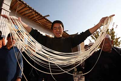 11月13日,循化縣新建村一位撒拉族青年在家中與朋友切磋拉面技藝。 今年以來,共青團青海省委與國家開發(fā)銀行青海分行聯(lián)合向循化撒拉族自治縣新建村65位青年農(nóng)民發(fā)放總額為520萬元的“青年創(chuàng)業(yè)小額貸款”,并組織他們進行拉面技術(shù)、市場分析和創(chuàng)業(yè)能力等方面的培訓(xùn),幫助當?shù)厍嗄暝谌珖_展以拉面飲食經(jīng)濟為帶頭產(chǎn)業(yè)的創(chuàng)業(yè)活動。 | |