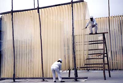 在四川德陽市中江縣永太鎮(zhèn),兩位身著工作服的村民在曬掛面。 中江掛面源于宋代,至今已有一千多年的歷史,以其獨(dú)特的工藝和極佳的口感深受人們歡迎。近年來,四川德陽市對(duì)中江縣掛面生產(chǎn)采取新型監(jiān)管模式,由龍頭企業(yè)帶動(dòng)小作坊,制定嚴(yán)格的工藝流程標(biāo)準(zhǔn),使傳統(tǒng)的中江掛面煥發(fā)了新的生機(jī)。據(jù)統(tǒng)計(jì),目前中江縣數(shù)百戶掛面生產(chǎn)作坊年均增收4000元左右。 | |