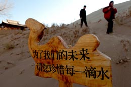 11月29日,幾名游客從月牙泉旁矗立的節(jié)水宣傳牌旁走過。