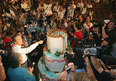 11日,在印度尼西亞巴厘島國際會議中心,日本環(huán)境大臣鴨下一郎切下紀(jì)念《京都議定書》通過10周年的蛋糕。當(dāng)天,聯(lián)合國氣候變化大會舉行新聞發(fā)布會,紀(jì)念《京都議定書》通過10周年。1997年12月11日,在日本京都召開的《聯(lián)合國氣候變化框架公約》締約方第三次會議通過了旨在限制溫室氣體排放量以抑制全球變暖的《京都議定書》。