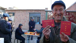 12月13日,河北省東光縣大曹村生活困難的五保農(nóng)民高興地領(lǐng)取供養(yǎng)金。國家級貧困縣東光縣今年籌措資金270多萬元,將全縣2200名五保農(nóng)民全部納入縣財政供養(yǎng)范圍,每月每人發(fā)放一百元供養(yǎng)金。
