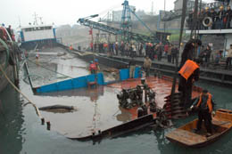 12月17日,救援人員對(duì)失事的液態(tài)燒堿貨船進(jìn)行打撈。