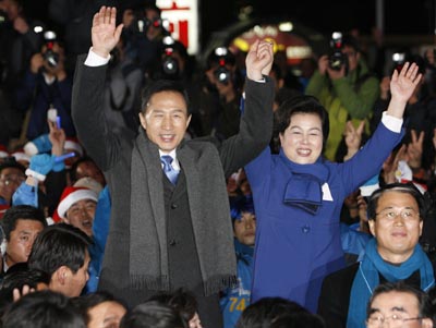 19日,在韓國首都首爾的大國家黨總部,大國家黨總統(tǒng)候選人李明博(左)與夫人和支持者們慶?偨y(tǒng)選舉獲勝。韓國中央選舉管理委員會19日晚宣布,李明博當(dāng)選韓國新一任總統(tǒng)。