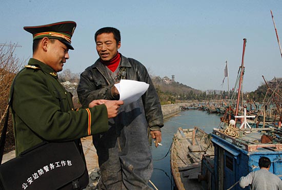12月24日,蓬萊市海港邊防派出所民警在蓬萊閣景區(qū)內(nèi)向靠港避風(fēng)的漁民進(jìn)行法制宣傳教育。