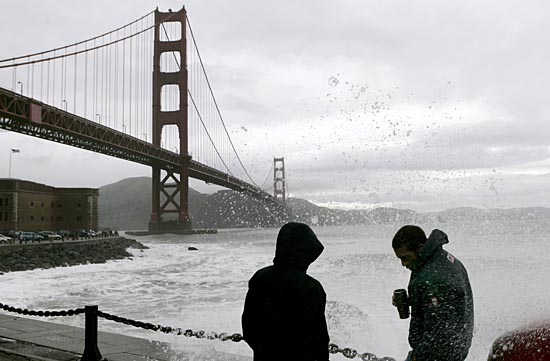 5日,在美國加利福尼亞州的舊金山,兩名男子站在金門大橋旁的岸邊上?耧L(fēng)、暴雨和大雪4日至5日席卷加利福尼亞州,導(dǎo)致一些地區(qū)面臨洪水和泥石流威脅。