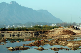 這是新安江源頭之一的橫江齊云山段。采砂后留下的砂堆與環(huán)境極不協(xié)調(diào)。不遠處山脈就是國家級名勝風(fēng)景區(qū)齊云山(1月5日攝)。 地處新安江源頭的安徽省黃山市休寧縣,是皖南生態(tài)保護區(qū)的一部分。近年來,隨著一些重點建設(shè)工程的開工和當(dāng)?shù)亟?jīng)濟的發(fā)展,對砂石的需求量越來越大,導(dǎo)致該縣對境內(nèi)新安江源頭的兩條主要河流的砂石資源進行過度開采,河床遭到挖掘、兩岸濕地被破壞、河流自身凈化能力下降,沿河水體生態(tài)鏈和周圍環(huán)境受到影響。 |