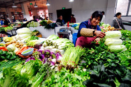 1月8日,一名蔬菜攤主在整理自家菜攤上的蔬菜。 為穩(wěn)定以豬肉為重點(diǎn)的副食品價(jià)格,杭州市不斷深化“微利肉”“讓利菜”等銷售活動(dòng),并把讓利銷售的品種范圍擴(kuò)大到禽蛋等主要副食品。為此,杭州市工商局等部門從2008年1月至3月繼續(xù)對(duì)市區(qū)農(nóng)貿(mào)市場(chǎng)的豬肉、大路蔬菜經(jīng)營(yíng)戶適當(dāng)減免市場(chǎng)攤位費(fèi)。自2007年8月份開(kāi)展“微利售肉”活動(dòng)以來(lái),杭州市共有104家大型超市、農(nóng)貿(mào)市場(chǎng)和零售肉店參與了此項(xiàng)活動(dòng)。 |