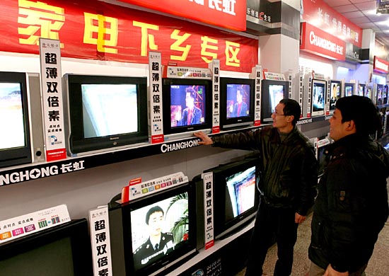 1月15日,四川省華鎣市雙河辦事處昭勛村的農(nóng)民在“家電下鄉(xiāng)”網(wǎng)點選購彩電。近日,四川省啟動“家電下鄉(xiāng)”試點工作。農(nóng)民購買補貼范圍內(nèi)的彩電、冰箱、手機類產(chǎn)品,憑有效證件可到當(dāng)?shù)氐泥l(xiāng)鎮(zhèn)財政所申領(lǐng)“家電下鄉(xiāng)”補貼,標(biāo)準(zhǔn)為家電產(chǎn)品銷售價格的13%。