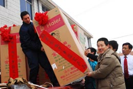 1月19日,煙臺市牟平區(qū)王家疃村村民鄒立遠(前右)在家門口收到送貨的電冰箱。