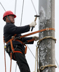 1月22日,凱里市供電部門職工在事故現(xiàn)場搶修供電設(shè)施。受大面積冰凍災(zāi)害天氣影響,貴州電網(wǎng)多處線路受損,黔東南苗族侗族自治州和銅仁地區(qū)有9個縣停止供電。凱里電網(wǎng)2000多名職工投入“抗冰保電”一線晝夜搶修。