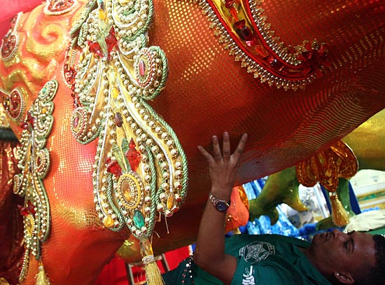 22日,在巴西里約熱內(nèi)盧的桑巴城,一名工人正在裝飾狂歡節(jié)花車。桑巴城是里約12支頂級桑巴舞隊(duì)的花車制造基地,隨著狂歡節(jié)的臨近,各支隊(duì)伍都在抓緊進(jìn)行花車裝飾工作。