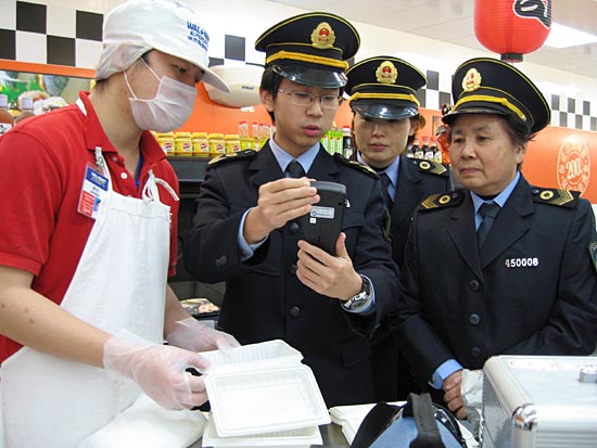 近日,廣西衛(wèi)生監(jiān)督部門在南寧市開展“廣西2008衛(wèi)生執(zhí)法一號”執(zhí)法行動。檢查組對餐飲單位、旅游景點、賓館飯店、集貿市場和年貨市場進行了執(zhí)法檢查。圖為衛(wèi)生執(zhí)法人員在一家超市檢測一次性碗筷是否符合衛(wèi)生標準。
