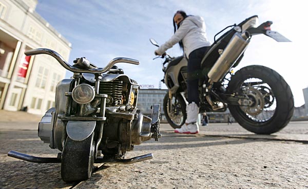 1月31日,在德國(guó)萊比錫舉行的摩托車展示會(huì)上,一名騎著普通摩托車的女子觀看一輛2公斤重的迷你摩托車。這種摩托車只有人腳大小,時(shí)速卻可達(dá)到20公里。新華社/法新
