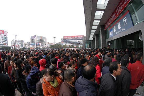 2月12日,南充火車站站前廣場(chǎng)上站滿了排隊(duì)購(gòu)票的旅客。