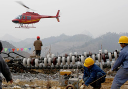 2月17日,一架直升機在廣東省樂昌市云巖鎮(zhèn)對遭受冰雪災害的±500千伏江城輸電線路的災后重建情況進行巡查。江城輸電線路的鐵塔多位于深山老林中,那里的積雪覆冰尚未融化,人工巡查的難度很大。連日來,國家電網(wǎng)公司啟用直升機對江城輸電線路所處的高山區(qū)域進行巡查,并用機載設備進行拍攝,及時發(fā)現(xiàn)故障和隱患,為全面恢復供電提供資料。