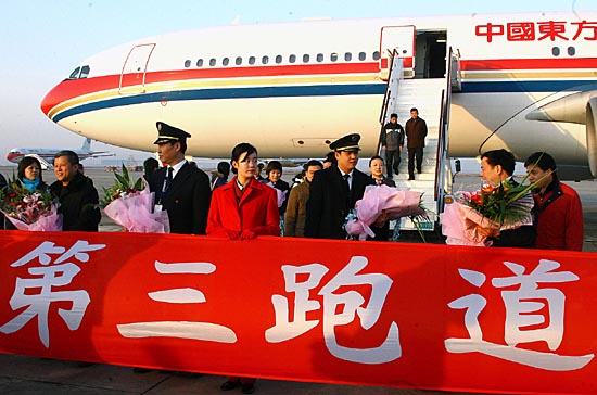 2月19日,中國東方航空公司的一架空客A340大型客機在上海浦東國際機場第三跑道試飛成功。據(jù)悉,第三跑道為4F等級,可起降未來全球最大的客機A380。這條跑道計劃于2008年3月13日正式投入使用,將大大提高浦東機場運量保障能力,也標志上海成為全國首個擁有4條機場跑道的城市。