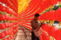 2月20日,一名工作人員檢查安裝好的紅燈籠。為迎接元宵佳節(jié),廣東省惠州市在濱江公園舉辦的大型游園燈會已準(zhǔn)備就緒,近萬盞紅燈籠將公園裝扮一新。