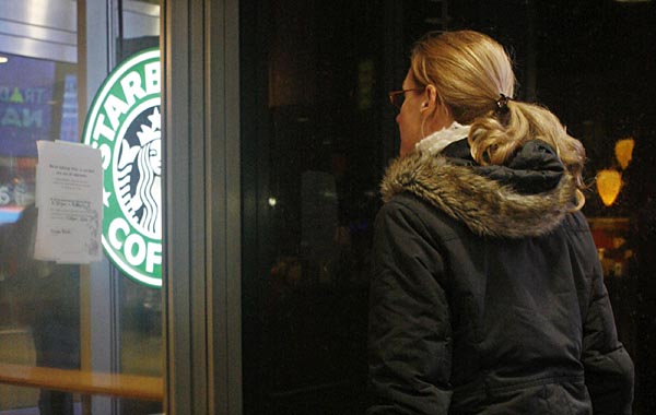 26日,一名行人在美國紐約一家星巴克咖啡店外觀看閉店通知。美國咖啡連鎖店巨頭星巴克當(dāng)日將全國7100家分店關(guān)閉3小時,對所有員工進(jìn)行烹制咖啡的培訓(xùn)。目前美國餐飲連鎖行業(yè)競爭激烈,因遭遇麥當(dāng)勞等競爭對手挑戰(zhàn),星巴克上周宣布裁員600人。新華社/路透