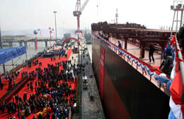 2月28日拍攝的交付儀式現(xiàn)場。當(dāng)日,民營江蘇熔盛重工集團有限公司制造的萬噸輪“GOLDEN SAGUENAY”交付。這艘冰區(qū)加強型散貨船總長225米,型寬32.25米,載重量7.55萬噸,是為挪威一客戶制造的,其各項技術(shù)指標(biāo)均達(dá)到或超過設(shè)計要求。