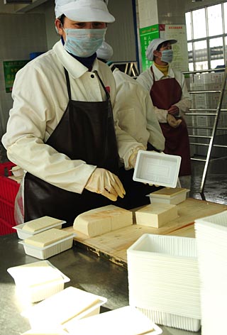 寧夏一家豆業(yè)公司工人正在包裝豆腐(3月4日攝)。 從2008年起,銀川市區(qū)全面推行豆制品定型包裝上市。除現(xiàn)場(chǎng)制售的加工店外,所有豆制品批發(fā)、零售業(yè)戶禁止銷(xiāo)售裸裝豆制品。上市豆制品應(yīng)標(biāo)明廠名、廠址、生產(chǎn)日期、保質(zhì)期、產(chǎn)品執(zhí)行標(biāo)準(zhǔn)及生產(chǎn)許可證編號(hào)、QS標(biāo)志等內(nèi)容,清真豆制品包裝要標(biāo)明清真標(biāo)志。 | |
