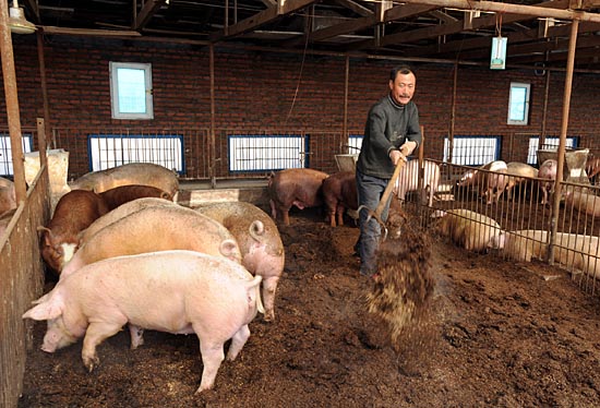 3月7日,九臺(tái)市西營城鎮(zhèn)楊家崗村飼養(yǎng)員趙殿坡在翻動(dòng)豬圈里的稻殼。據(jù)介紹,他現(xiàn)在飼養(yǎng)500頭豬,每天只工作六個(gè)小時(shí)。按傳統(tǒng)方式他最多只能飼養(yǎng)150頭豬。 一種“生態(tài)養(yǎng)豬”技術(shù)目前正在吉林農(nóng)村走俏。與傳統(tǒng)養(yǎng)豬方式相比,“生態(tài)養(yǎng)豬”技術(shù)主要以秸稈、鋸末、稻殼等墊圈料,添加天然鹽、微生物、營養(yǎng)劑等混合成發(fā)酵床,通過生物乳酸菌發(fā)酵技術(shù)分解豬糞便,保持圈舍溫度適宜,以利于生豬發(fā)育生長。據(jù)悉,利用“生態(tài)養(yǎng)豬”技術(shù)每頭豬出欄可增加效益150元左右。目前長春地區(qū)生態(tài)養(yǎng)豬戶已達(dá)58戶,有生態(tài)豬舍128棟,飼養(yǎng)規(guī)模約6.4萬頭。 | |