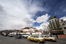 3月19日,車輛行駛在拉薩北京中路布達(dá)拉宮前。目前,拉薩市區(qū)各個路段車輛自由通行,大部分商店恢復(fù)營業(yè),高校以及中小學(xué)正常上課,拉薩社會秩序基本恢復(fù)正常。