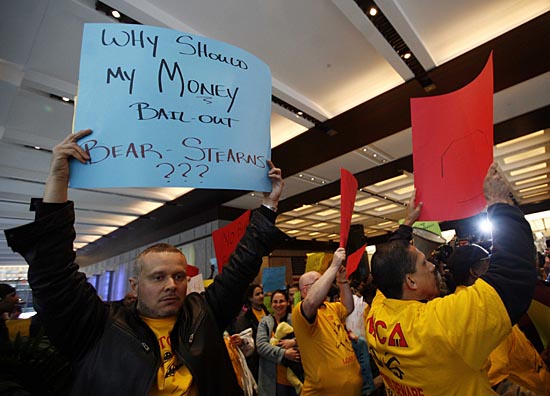 26日,在美國知名投資銀行貝爾斯登位于紐約曼哈頓的總部大樓內(nèi),一名美國鄰里協(xié)助公司的抗議者手持寫有“為什么用我的錢援助貝爾斯登”的紙片抗議。大約60名抗議者當天闖入貝爾斯登的總部大樓,抗議美國聯(lián)邦儲備委員會為貝爾斯登提供特別融資援助,要求為眾多貸款買房者提供幫助。新華社/路透