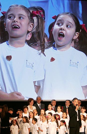 3月31日,在法國(guó)巴黎舉行的國(guó)際展覽局大會(huì)上,來(lái)自意大利的小朋友與著名盲人歌唱家安德烈·波切利(前右)一起為米蘭歌唱。當(dāng)天,在巴黎舉行的國(guó)際展覽局大會(huì)上,意大利的米蘭以86票贏得2015年世界博覽會(huì)主辦權(quán)。