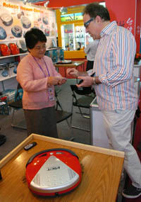 4月16日,一位臺(tái)灣參展商(左)在廣交會(huì)上介紹智能吸塵器。